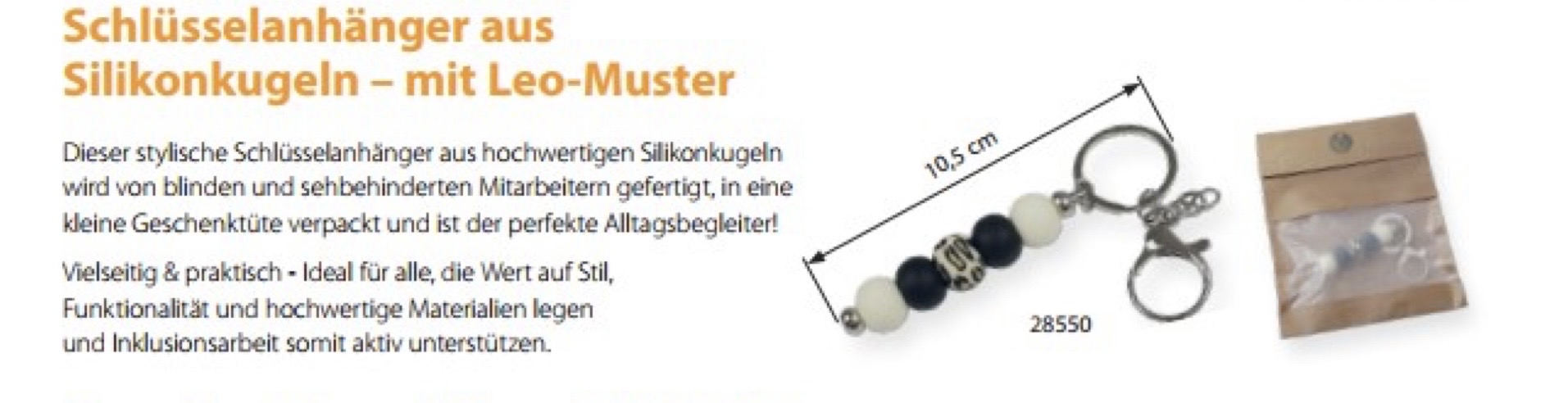 Dieser stylische Schlüsselanhänger aus hochwertigen Silikonkugeln ist der perfekte Alltagsbegleiter! Von blinden und sehbehinderten Mitarbeitern in harmonischen Beige- und Schwarztönen gefertigt, kombiniert mit einem trendigen Leopardenmuster, wird er schnell zu Ihrem neuen Lieblingsaccessoire.